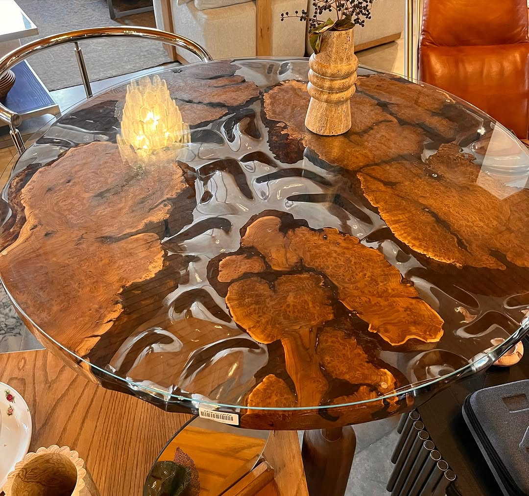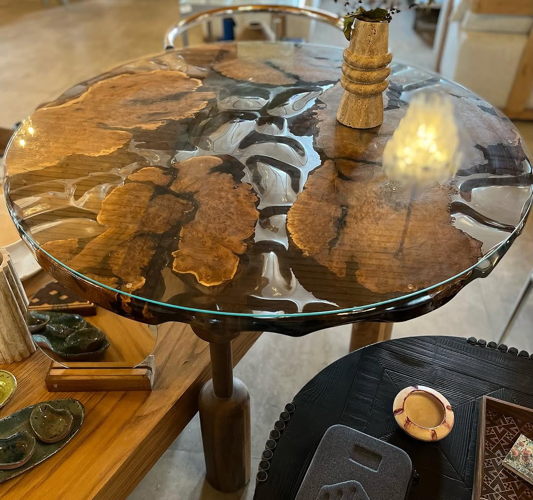 این میز با ترکیب جادویی رزین و جوش سنجد کاملا کار دست است. فرآیند ساخت آن زمان و هنر زیادی میطلبد.پایه ها ساخته شده از چوب گردو و سبک خاص رزین اپوکسی مواج زیبایی میز را چند برابر کرده است.